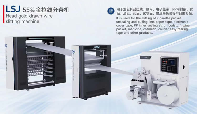 LFT(40/48/655/60/100/120)头拉线分条机,主要用来生产2000-120000米烟包、食品、酒包、药品、化妆品、磁带等产品的包装盒或包装袋的拆封拉线、防伪拉线、金拉线、织唛线、金拉线等易撕线,具有自动化程度高,生产效率高,产品精度高等优点。